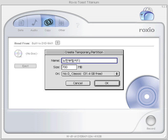 Create Temporary Partision을 클릭하셔서 가상볼륨을 하나 만듭니다.